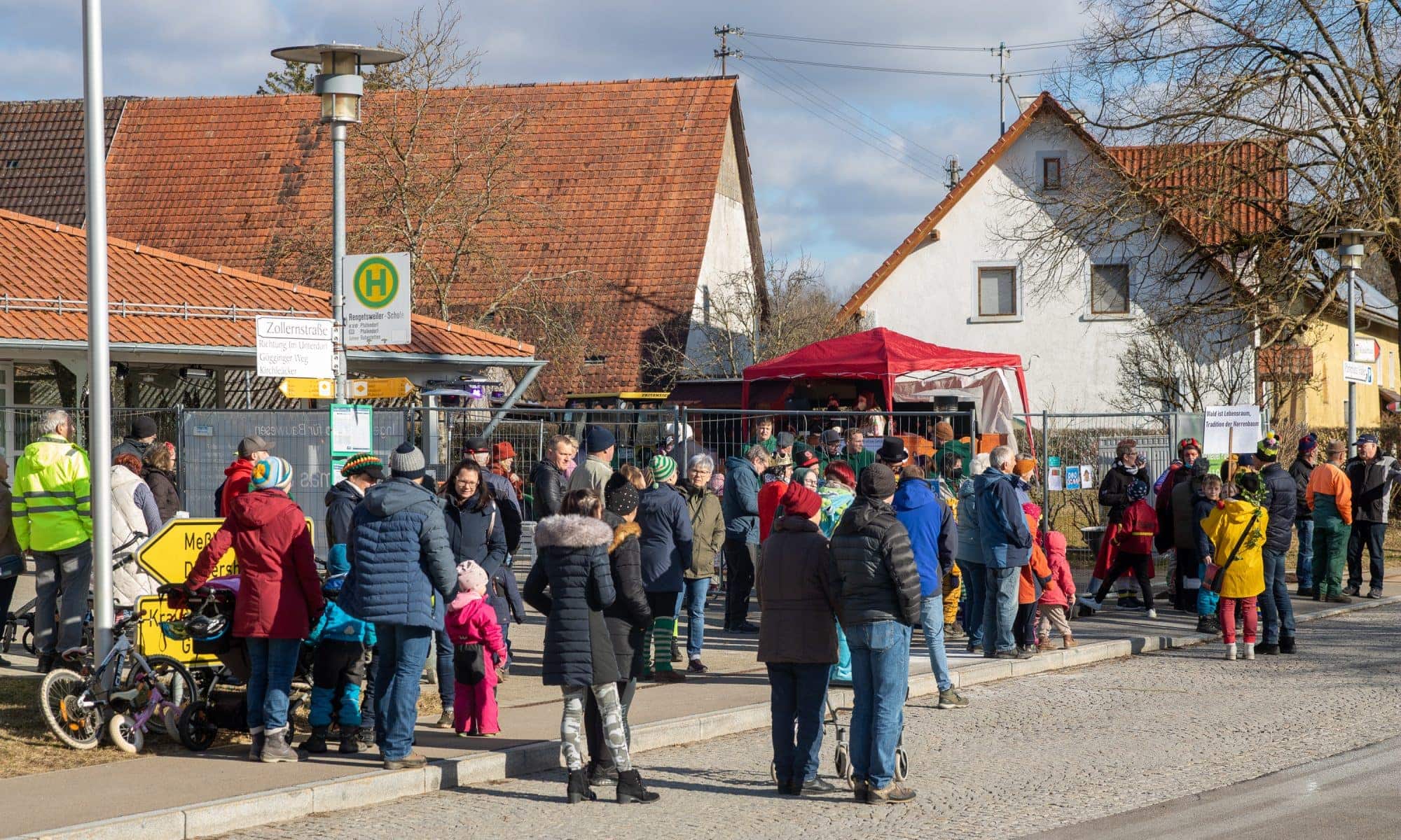 Auch dieses Jahr fand die Fasnet in Rengetsweiler unter erschwerten Corona-Bedingungen statt. Dennoch ließen es sich die Randenmale mit tatkräftiger Unterstützung der Freiwilligen Feuerwehr nicht nehmen, am Fasnet-Samschtig, den 16.02.2022 einen Narrenbaum zu stellen. Musikalisch begleitet wurden sie dabei von den Rengetsweiler Musikanten.