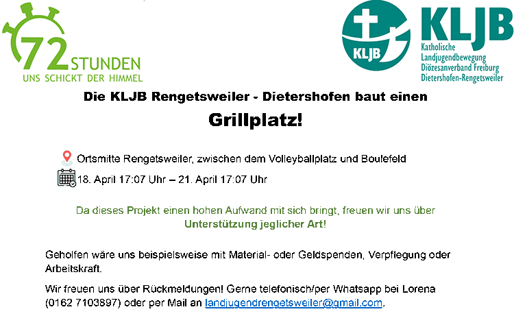 « Alle VeranstaltungenDiese Veranstaltung hat bereits stattgefunden.72 Stunden Aktion18. April 2024 um 17:07 bis 21. April 2024 um 17:07« Anknattern 2024Maibaumstellen » Zum Kalender hinzufügen Google Kalender iCalendar Outlook 365 Outlook Live Details Beginn: 18. April 2024 um 17:07 Ende: 21. April 2024 um 17:07 Veranstalter KLJB Dietershofen Rengetsweiler